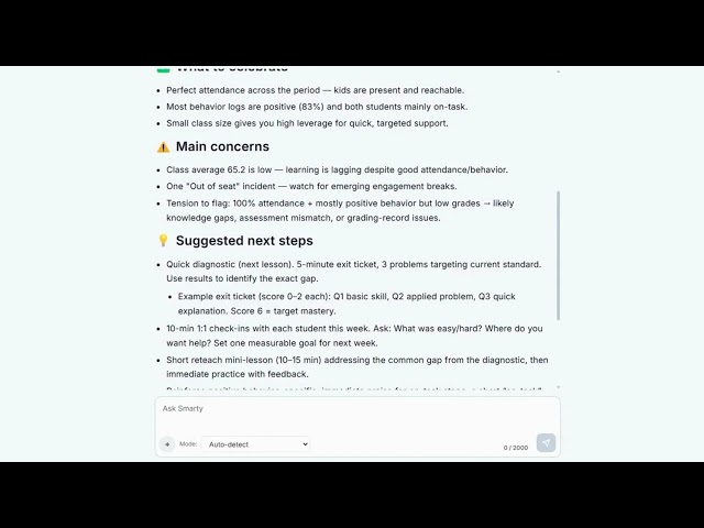 Smarty can help draft IEP-aligned accommodation ideas, scaffold lessons by reading level, suggest classroom supports, and draft clearer progress notes. Always review and adapt suggestions to fit your specific classroom needs.