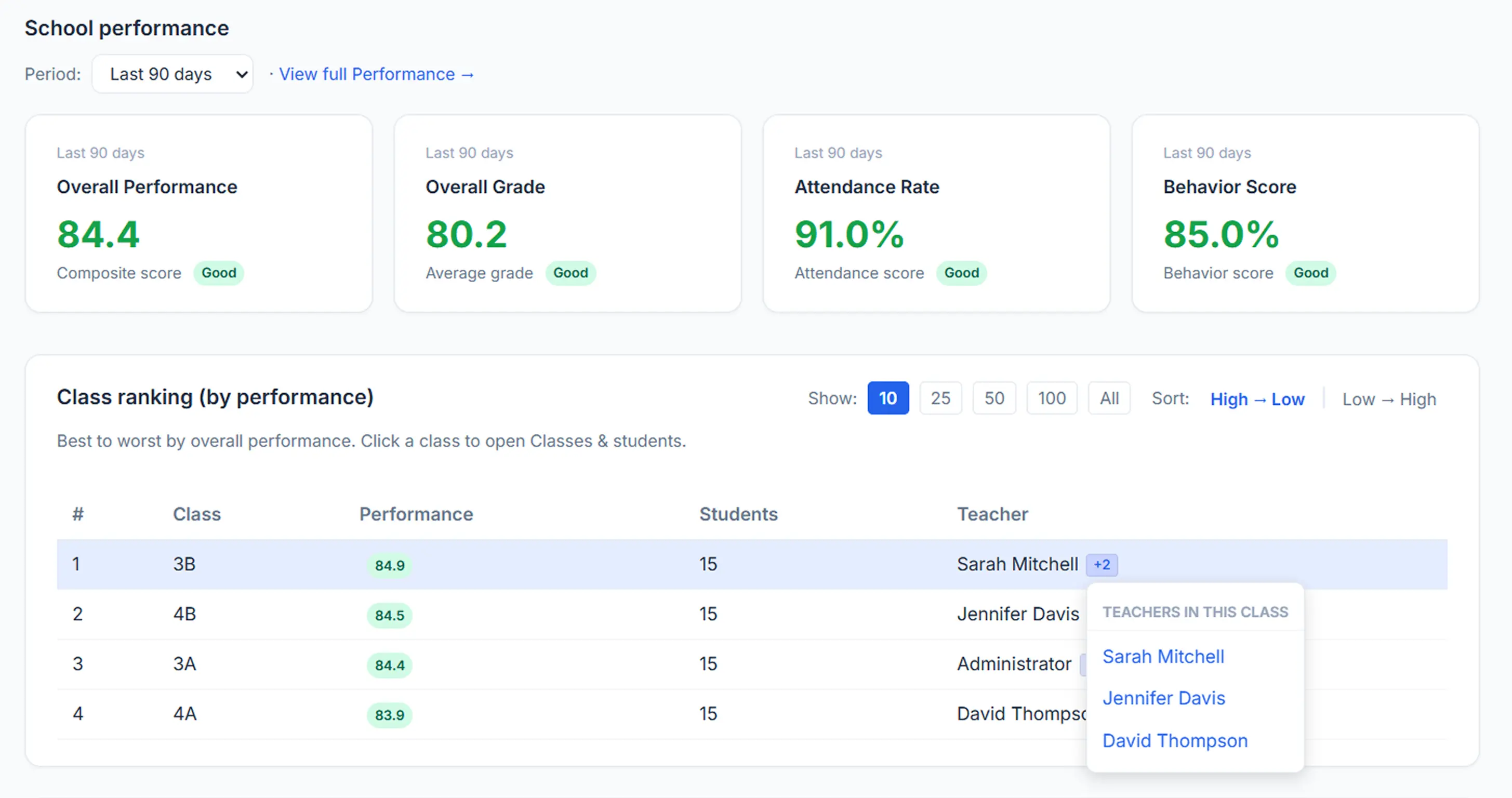 With role-based access, admins have full visibility while teachers see only their assigned classes.